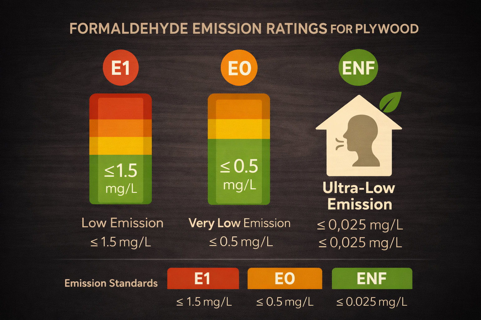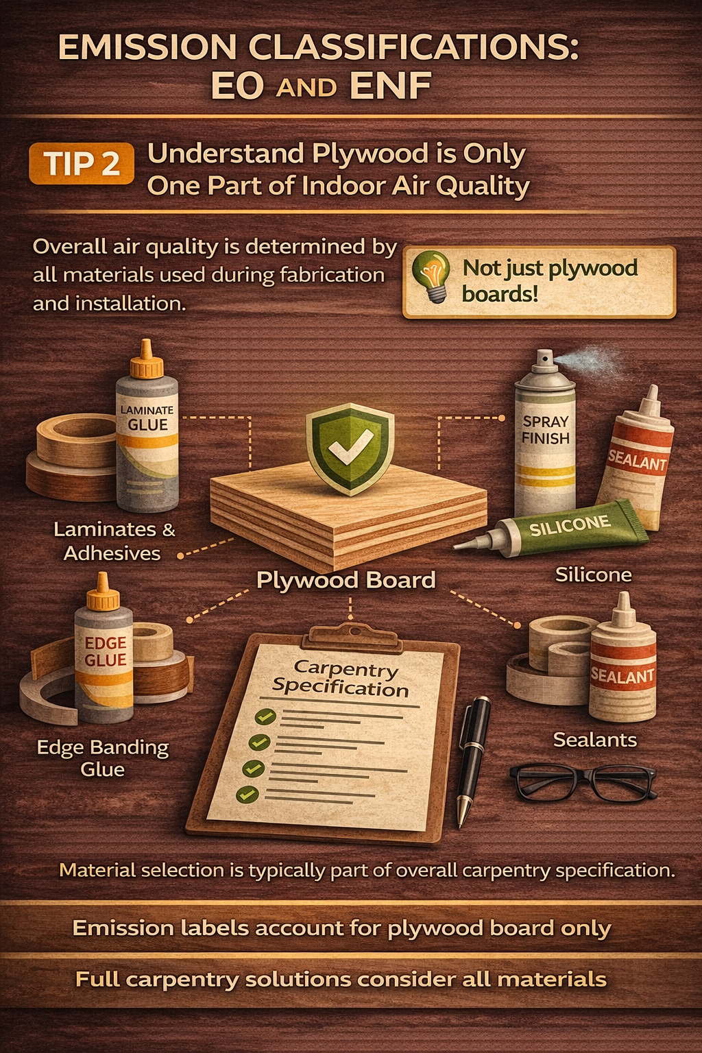Emission classifications such as E0 or ENF generally apply to the plywood board based on manufacturer testing conditions. Overall indoor air quality may also be influenced by other materials used during fabrication and installation such as: